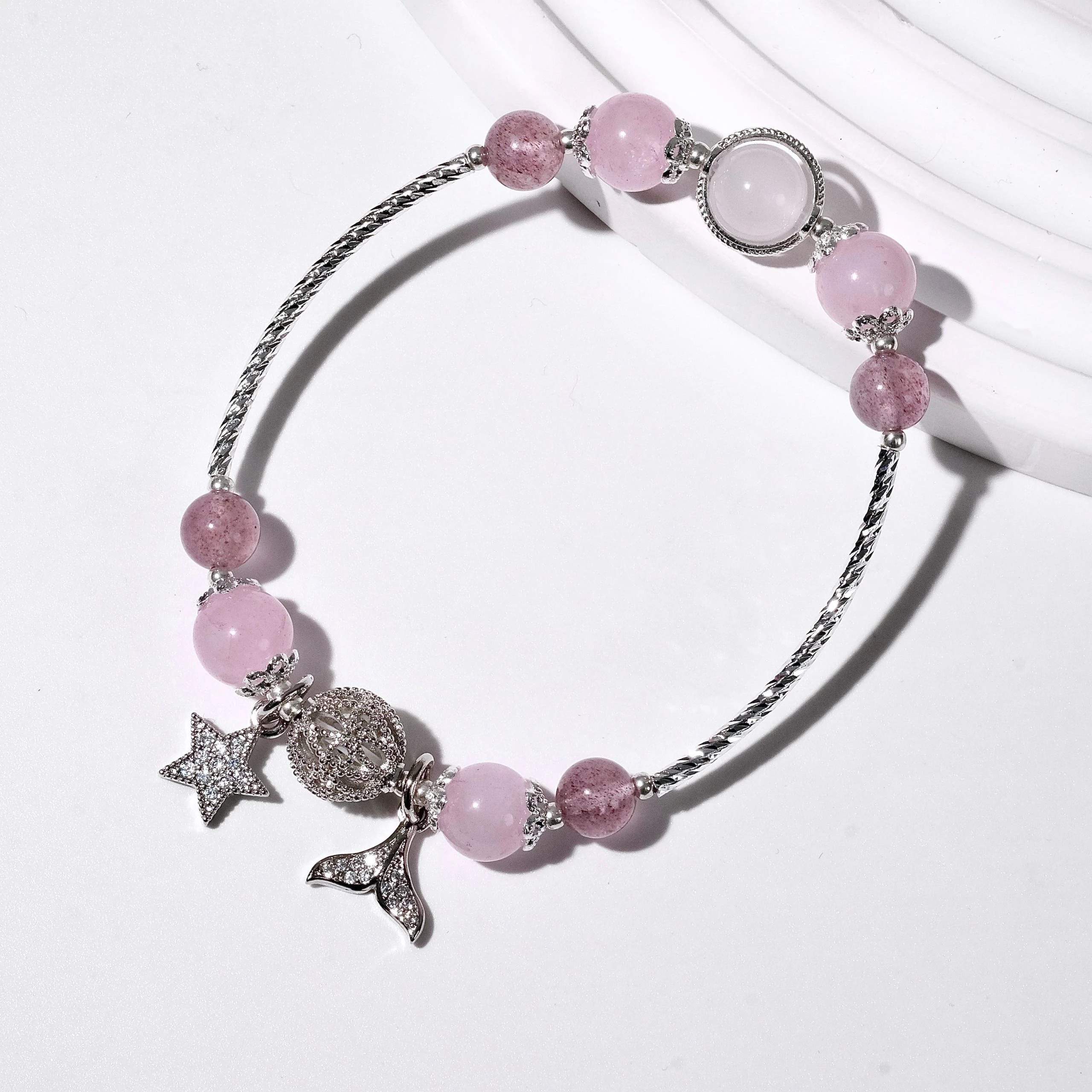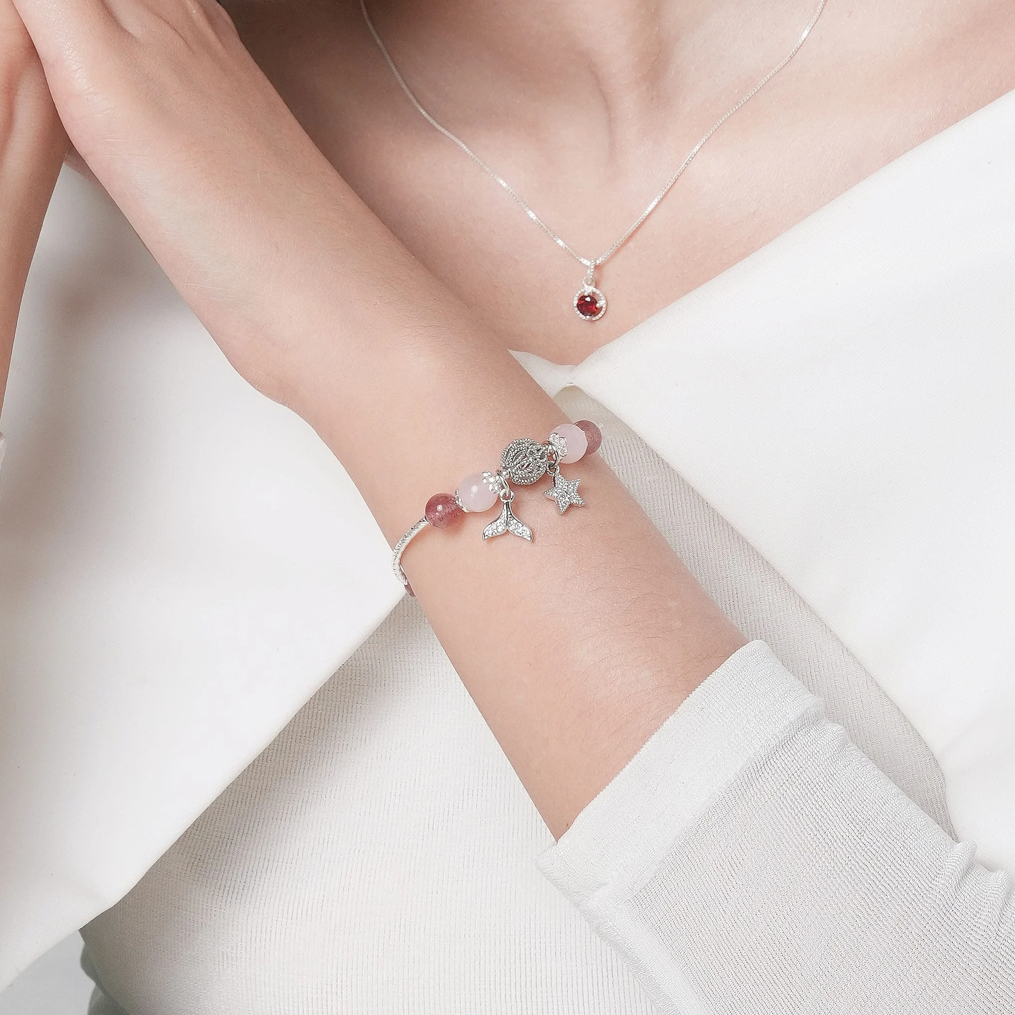 - Chất liệu: Đá Thạch Anh Dâu Hồng & Thạch Anh Hồng tự nhiên, charm kim loại mạ bạc / mạ vàng