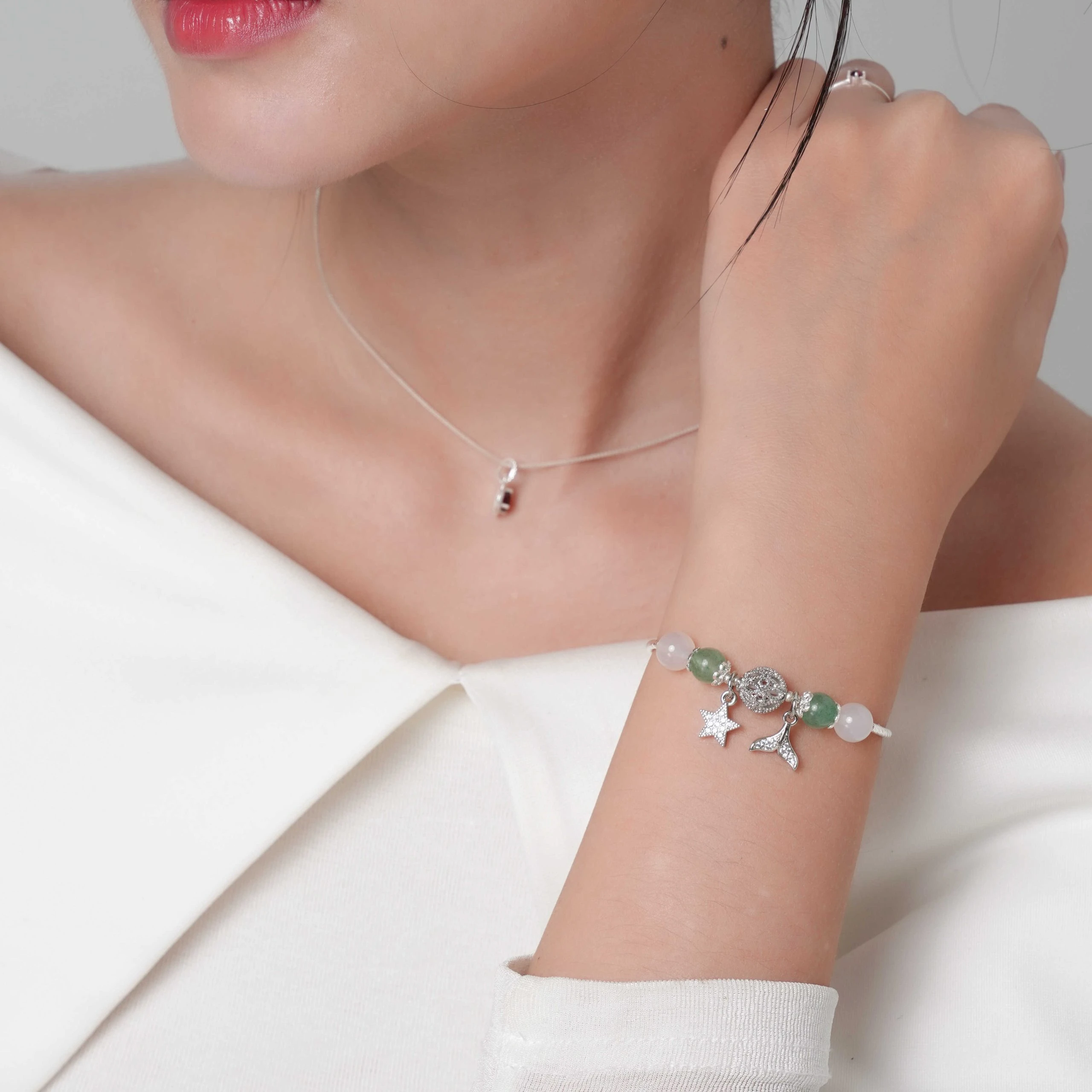 Vòng Dâu xanh mix mã não trắng charm vàng bạc