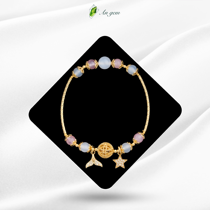 • Chất liệu: Đá tự nhiên (Thạch Anh Hồng, Mã Não Trắng), charm mạ bạc / mạ vàng
