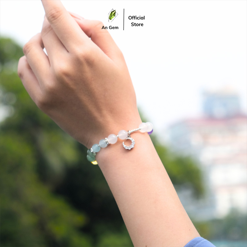 - Chất liệu: 7 loại đá tự nhiên (Mã Não Trắng, Thạch Anh Tím, Mã Não Đỏ, Thạch Anh Dâu Hồng, Thạch Anh Vàng, Thạch Anh Dâu Xanh, Aquamarine), charm kim loại mạ bạc