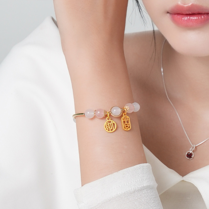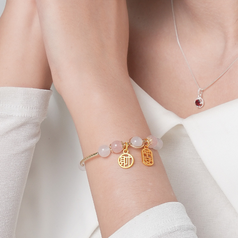- Thạch Anh Hồng & Mã Não Trắng – Charm Hoa Đào, mạ vàng